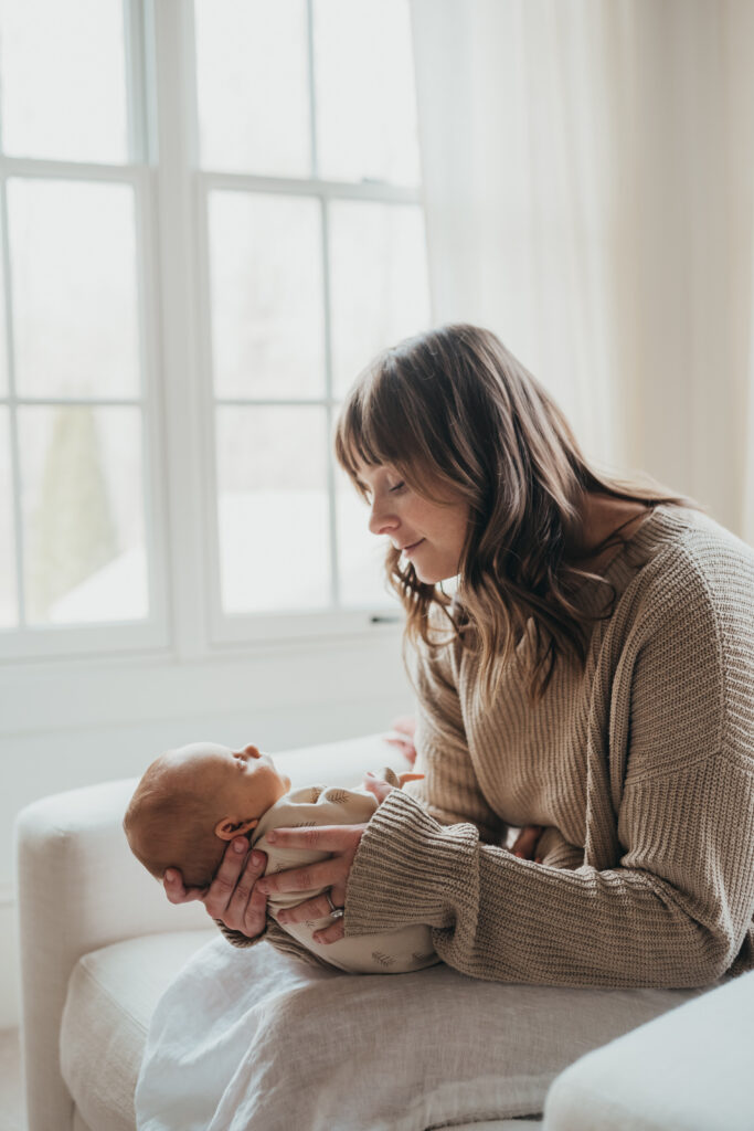 Boston newborn photography in my style is clean, natural, and true to life. I lean into neutral tones, soft textures, and the feeling of your actual home during this season. The bassinet next to your bed. The rocker in the nursery. The couch where you have been spending most of your time.